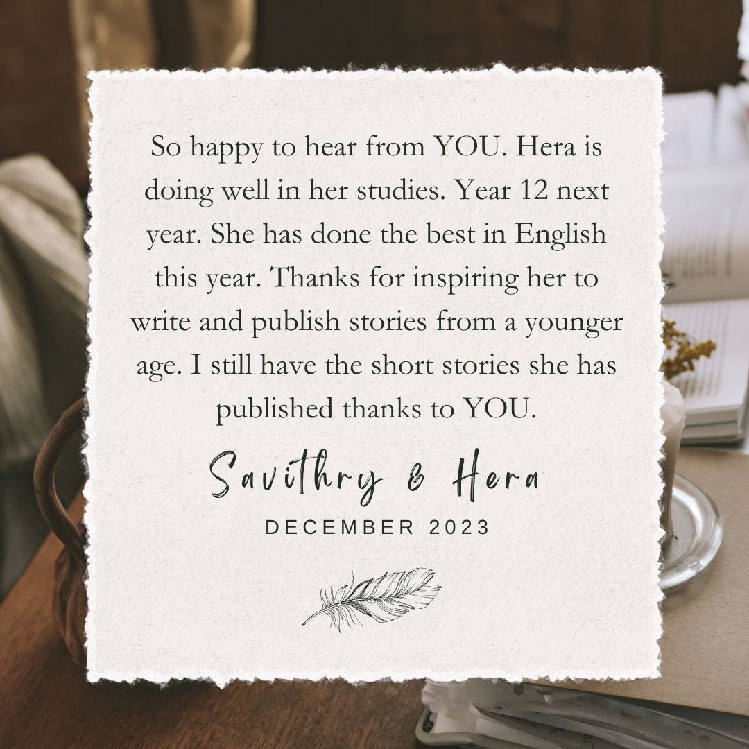 Thank you so much for your messages of support following our last newsletter! I have loved hearing news about young writers we havenât seen in a while, receiving messages of excitement to join us in the new year, and seeing enrolments start to come in. This next chapter of our story feels good already.